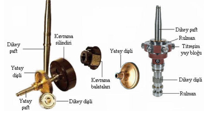 Devir hareketi, yatay dişli ve şaft kullanılarak dikey bir dişli vasıtasıyla dikey ana şafta ve nihayet çanak ile diğer elemanlara iletilir. Bu işlem sırasında yatay ve dikey dişliler arasında belirli bir devir yükseltme oranı bulunur. Bu nedenle ana şaft ve çanak, elektrik motorundan çok daha yüksek bir devirle dönerler. Genellikle yatay dişli bronz malzemeden yapılır ve “bronz dişli” olarak adlandırılırken dikey dişli krom kaplı malzemeden yapıldığı için “krom dişli” olarak anılır.