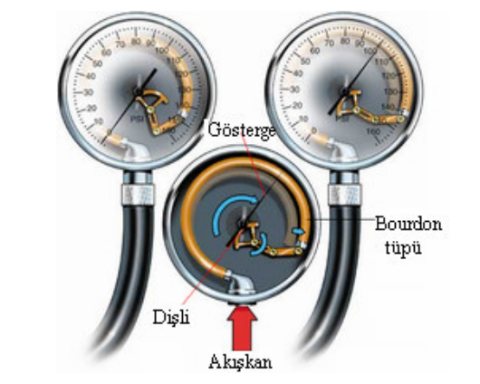 7.5 BASINÇÖLÇER (BASINÇ GÖSTERGESİ, MANOMETRE) Basınç Ölçer Çeşitleri: Basınç ölçerler, uygulama türüne ve ihtiyaca göre farklı çeşitlere sahiptir. İşte bazı yaygın basınç ölçer türleri: Basınç Ölçüm Birimleri: Basınç ölçümleri farklı birimlerde yapılabilir, ancak en yaygın olanları bar, psi (pound per square inch),