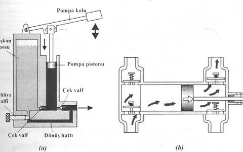 2.2 Çift Etkili Pistonlu Pompalar Çift etkili pistonlu pompalarda, pistonun yukarı hareketiyle sol alt taraftaki emme valfi ve sağ üst taraftaki basma valfi açılarak akışkan emilirken; pistonun aşağı hareketi sırasında sağ alt taraftaki emme valfi ve sol üst taraftaki basma valfi açılarak