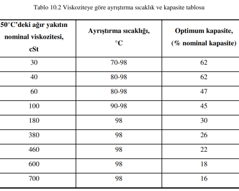 10.10.2.1 Yakıt Ayrıştırıcısında Kapasite Ayarı Tablo 10.2, yakıtın viskozitesine ve ayrıştırma sıcaklığına göre ayrıştırıcı kapasitesini belirlemek için kullanılan bir rehberdir. Yakıtın viskozitesi, yakıtın akışkanlığını etkileyen önemli bir parametredir. Daha yüksek viskoziteli yakıtlar daha yavaş akar ve daha fazla ısıya ihtiyaç duyar. Bu