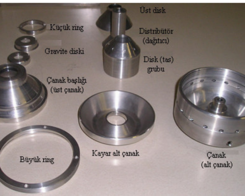 10.7.7.1 Disk (Tas) Grubu Ayrıştırıcıya giren yağlama yağı ve yakıtı ayıran pek çok sayıda ve konik şekilli elemana “disk” veya “tas” adı verilmektedir. Taslar, distribütör üzerine delikleri aynı hizada olacak şekilde sıralanır ve üzerlerine “üst disk” adı verilen yine konik bir parça