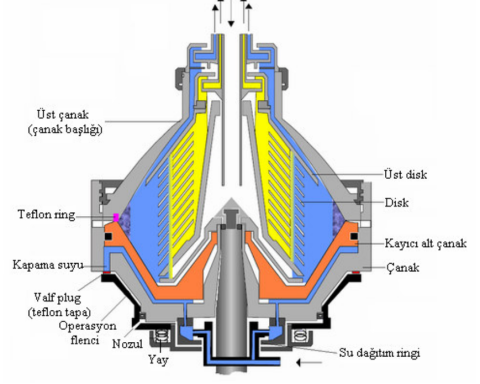 10.7.7 ÇANAK (ALT ÇANAK) VE ÇANAK İÇİNDEKİ ANA PARÇALAR Ayrıştırıcılar içindeki en önemli bileşenlerden biri, birkaç bin devirle dönen ve ayrıştırma işleminin temelini oluşturan parçalardır. Bu ayrıştırıcı parçalar, Şekilde gösterilen alt çanağın içine monte edilmek üzere tasarlanmıştır. Diğer işlem elemanları, bu alt