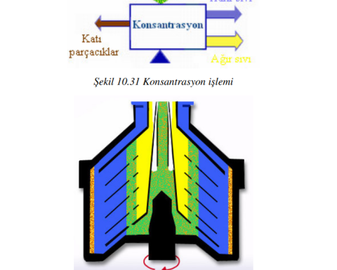 10.3.3 KONSANTRASYON (SIVI-SIVI AYRIŞTIRMASI) Konsantrasyon metodu, sıvı-sıvı ayrıştırmaya benzerlik göstermekle birlikte, temel amacı düşük yoğunluğa sahip fazı değil, Şekil 10.31 ve 10.32’de gösterildiği gibi yüksek yoğunluğa sahip fazı ayrıştırmak olan bir yöntemdir. Bu yöntem, gemilerde kullanılmaz; daha çok endüstriyel işlemlerde ve tesislerde